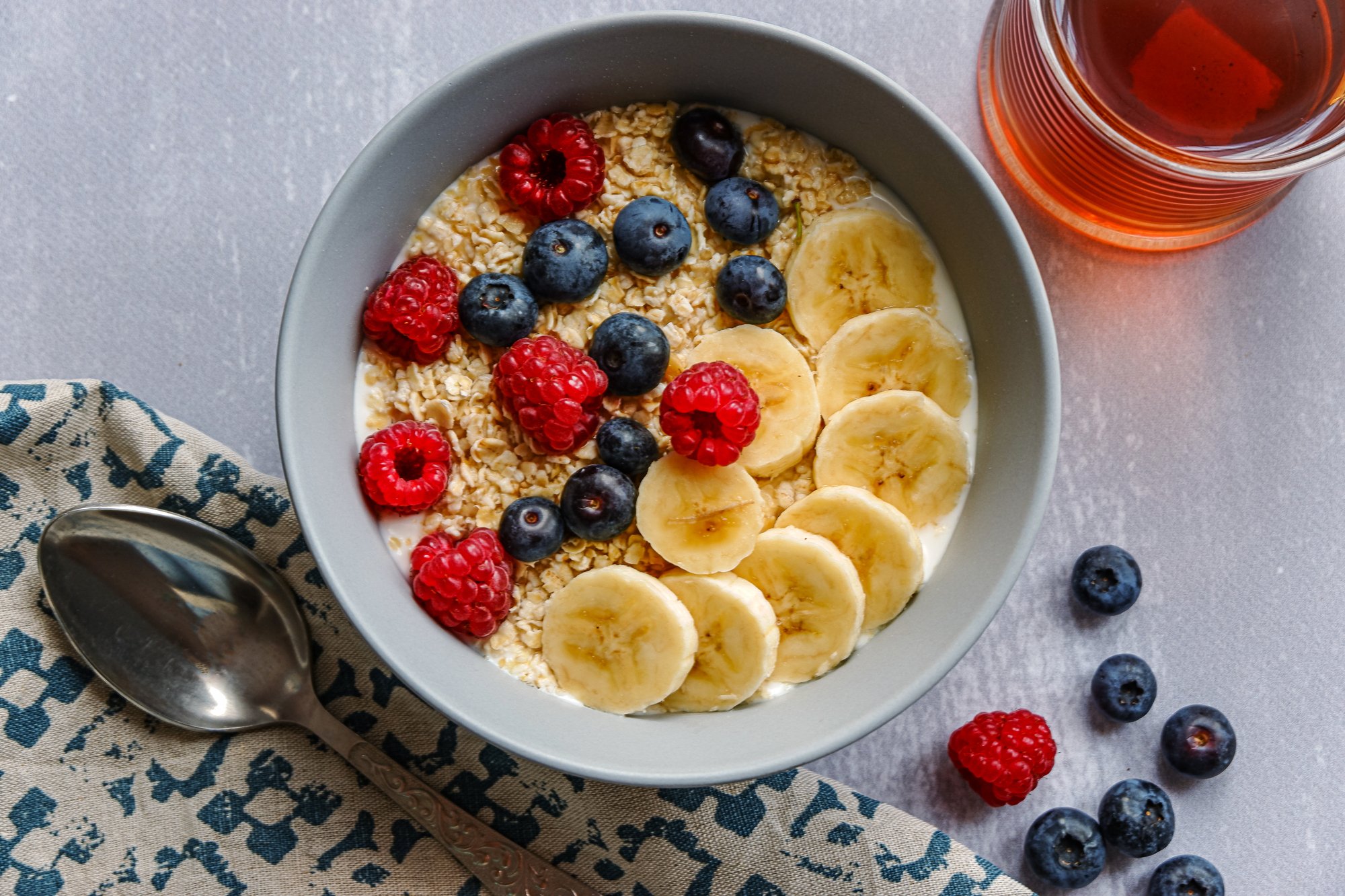- Oatmeal protein: 40g oats + 200 ml susu rendah lemak + 1 telur rebus + ½ pisang iris.